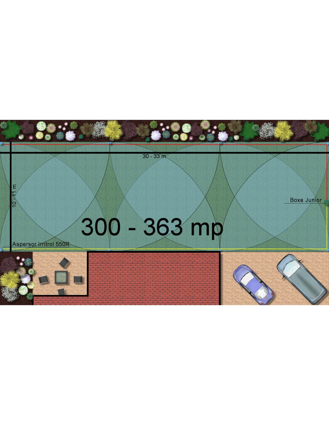 Proiectul a fost realizat si calculat pentru o sursa de apa cu presiune dinamica de 2.5-3.5 bari la un consum de 45 litri / minut. Alte valori la parametrii sursei de apa pot influenta eficienta sistemului de irigat prin diferente rezultate in raza de actiune a aspersorului. Daca nu aveti parametri necesari si nu gasiti un kit de irigare gazon potrivit pentru gazonul Dvs, contactati-ne pentru consultanta si proiectare gratuita!!!